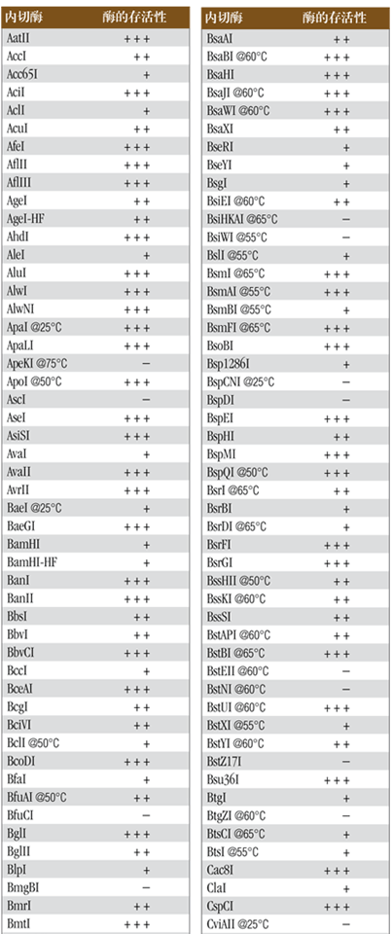 0.13 單位的酶量;表中標(biāo)注有“++/+” 的酶是具有中等活性的延時內(nèi)切酶,16 小時完全酶切