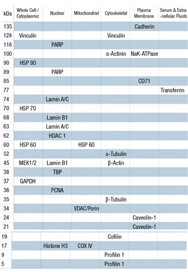 Actin,一種廣泛表達的真核蛋白,是細胞骨架的重要組分。研究證明在原始乳腺癌細胞中Actin是高度磷酸化的(9)。研究也發(fā)現(xiàn)凋亡條件下體外和心臟肌肉以及骨骼肌中都能觀察到Actin的清除(10),因此,不適用于骨骼肌的樣品。Caspase-3對Actin的清除會加速泛素/蛋白酶體依賴的肌肉蛋白酶解(11)。 細胞生長條件的改變以及與胞外基質(zhì)組分的相互作用都可能會導(dǎo)致Actin蛋白合成的變化 。