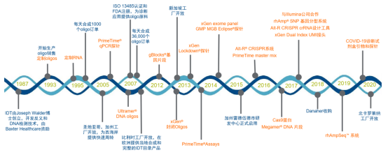 美國IDT公司,總部位于美國愛荷華州科勒爾維爾,成立于 1987年,是基因組學(xué)領(lǐng)域開發(fā)的領(lǐng)先者,也是公認(rèn)的定制核酸生產(chǎn)行業(yè)的領(lǐng)導(dǎo)者。下圖是IDT從成立至今的重大事件圖鑒(藍(lán)色是資本并購,橙色是技術(shù)產(chǎn)品革新)。