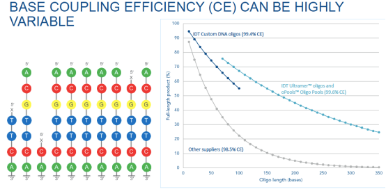 IDT的合成Oligo憑借其高質(zhì)量標(biāo)準(zhǔn)受到全世界科研者的青睞。IDT 采用合成柱法的方式單獨合成每條Oligo,在每個堿基耦合的過程中涉及到一個“偶聯(lián)效率”的概念,造就了超高的合成精度。同時IDT合成的高質(zhì)量不是說出來的,嚴(yán)謹(jǐn)?shù)馁|(zhì)控更是將產(chǎn)品質(zhì)量拿捏的死死的,每條Oligo通過ESI-MS(電噴霧質(zhì)譜)質(zhì)譜的方式,讓錯誤的Oligo無所遁形,并且每一個通過質(zhì)檢的oligo都有一個質(zhì)控報告,也為后期IVD客戶做申報工作提供了極大的便利。