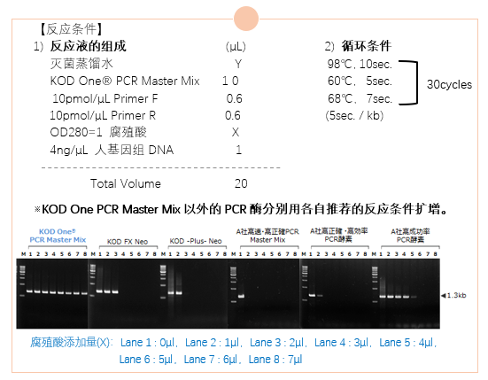 東洋紡產(chǎn)品KOD OneTM PCR Master Mix/ KOD OneTM PCR Master Mix -Blue-(Code:KMM-101/KMM-201)因其對土壤腐殖酸的高度耐受而廣受好評。并且在含有腐殖酸的人類基因組模板下,都可以輕松實(shí)現(xiàn)HBg基因的擴(kuò)增。