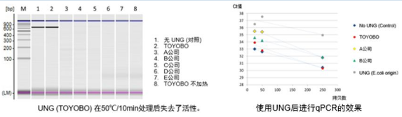 左圖,對比其他公司宣稱的熱敏性產(chǎn)品,50℃ 10分鐘處理后,將各UNG酶與含有U的PCR產(chǎn)物混合后37度進行溫育。只有TOYOBO的UNG在50度10分鐘處理后失去活性,沒有分解掉含有U的PCR產(chǎn)物。