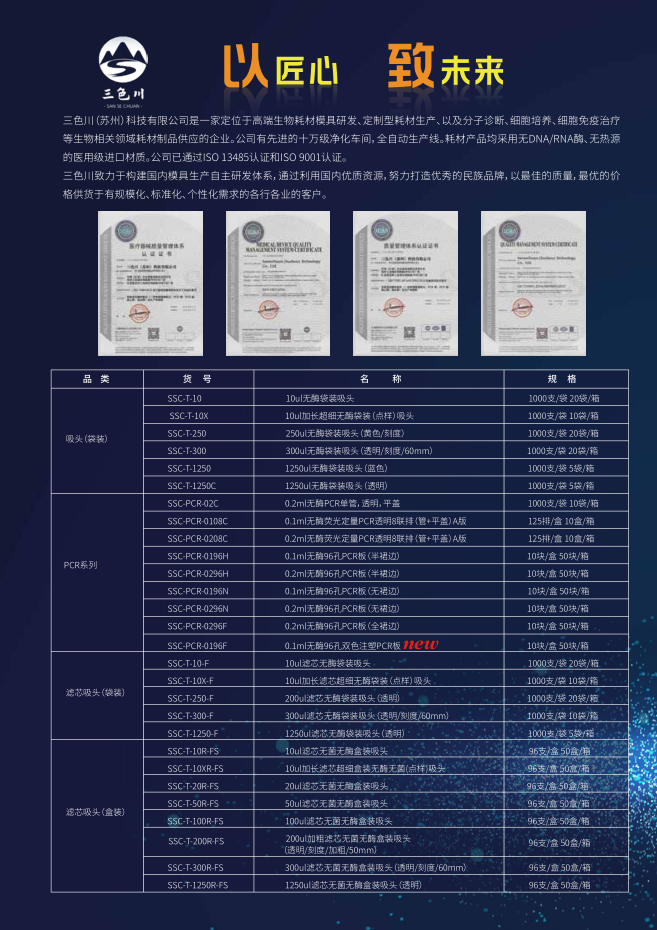 三色川(蘇州)科技有限公司是一家定位于高端生物耗材模具研發(fā)、定制型耗材生產(chǎn)、以及分子診斷、細(xì)胞培養(yǎng)、細(xì)胞免疫治療等生物相關(guān)領(lǐng)域耗材制品供應(yīng)的企業(yè)。公司有先進(jìn)的十萬級凈化車間,全自動生產(chǎn)線。耗材產(chǎn)品均采用無DNA/RNA酶、無熱源的醫(yī)用級進(jìn)口材質(zhì)。公司已通過ISO 13485認(rèn)證和ISO 9001認(rèn)證。