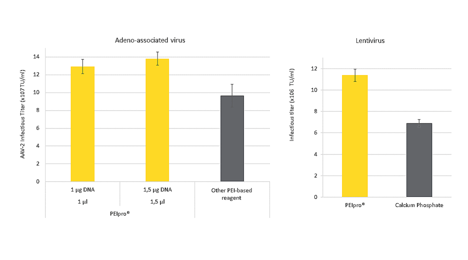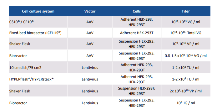 無論基于細(xì)胞培養(yǎng)的系統(tǒng)和生產(chǎn)規(guī)模如何,對于慢病毒和AAV, PEIpro?和PEIpro?-HQ的有效病毒載體產(chǎn)量分別優(yōu)于107IG/mL和109vg /mL。