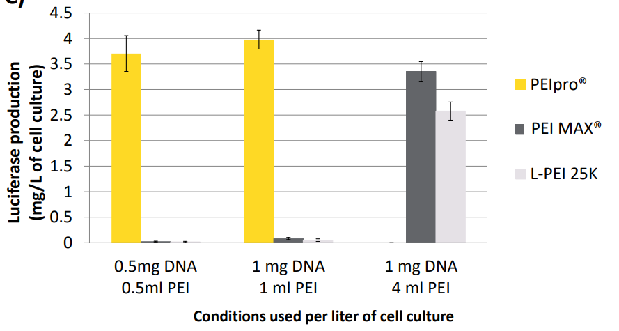 與其他PEI相比,PEIpro?所需試劑較少,DNA用量也較低。將HEK-293懸浮細(xì)胞以1 × 106/ml的濃度接種于無血清培養(yǎng)基中,用PEIpro?、PEI MAX?和L-PEI 25 kDa轉(zhuǎn)染。轉(zhuǎn)染48 h后用常規(guī)熒光素酶法檢測熒光素酶的表達(dá)。