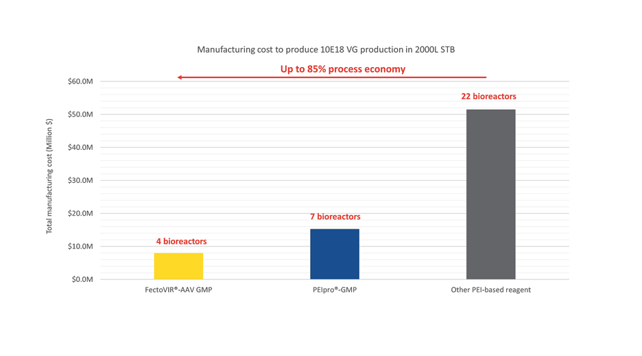 DSP后3O% AAV回收率,使用FectoVIR?-AAV生產(chǎn)10E18的AAV需要4個生物反應(yīng)器,使用PElpro ?需要7個生物反應(yīng)器,使用其他PEI需要22個生物反應(yīng)器。