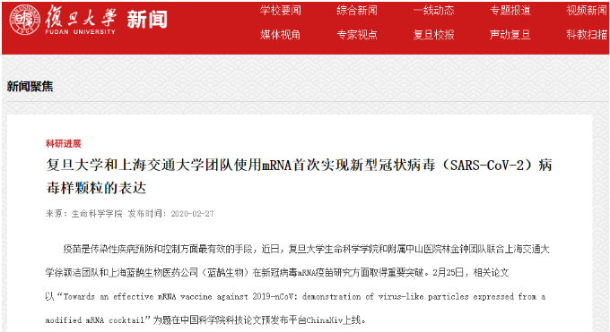 今天,復(fù)旦大學(xué)和上海交通大學(xué)在預(yù)印本網(wǎng)站ChinaXiv上,聯(lián)合報(bào)告了針對新型冠狀病毒SARS-CoV-2的mRNA疫苗研發(fā)的最新進(jìn)展,上海APExBio、藍(lán)鵲生物技術(shù)有限公司和廣州中山大學(xué)醫(yī)學(xué)中心也參與了該項(xiàng)目。